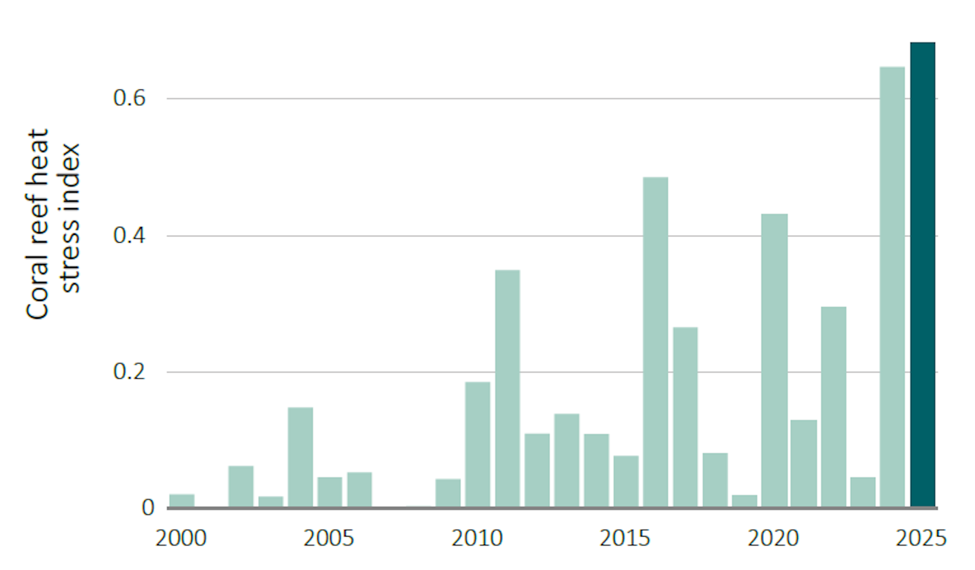 Annual coral reef heat stress around Australia, 1985–2025, measured as the average extent to which water temperatures at 24 monitored reef locations exceeded levels expected in a typical once-in-ten-year event. Australia’s Environment, CC BY