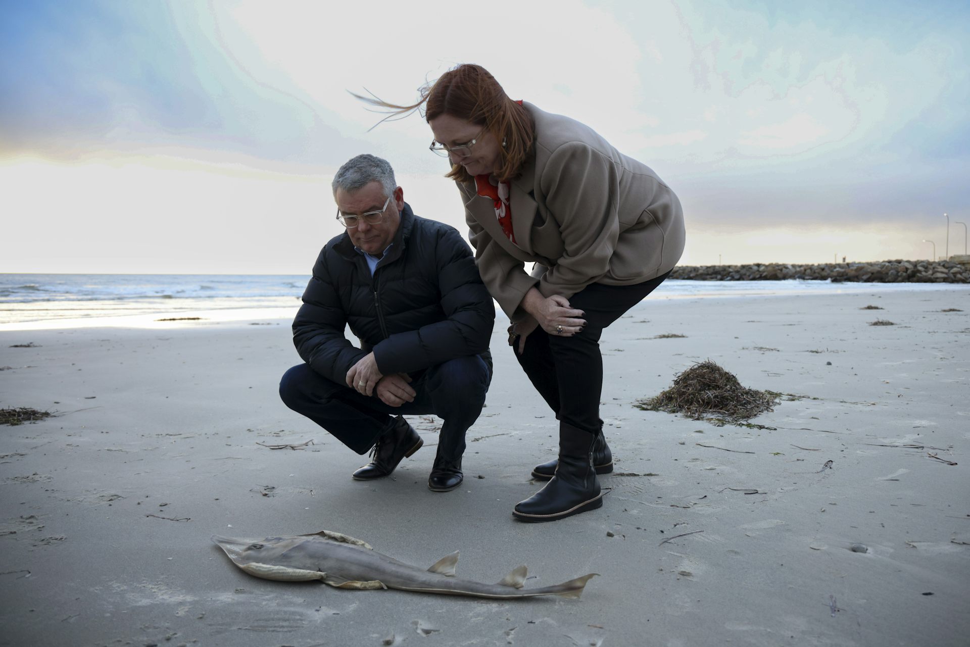 Federal Environment and Water Minister Murray Watt with Boothby MP Louise Miller-Frost look at a fish killed by the algal bloom at West Beach in July 2025. Matt Turner